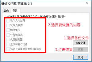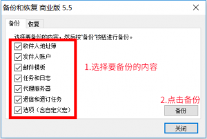 说明:对“收件人地址薄”“发件人账户”“邮件模板”“任务和日志”“代理服务器”“退信和退订任务”“选项(含文本宏、随机宏、同义词宏、自定义字段等)”分别(或全部)进行备份,按“备份”按钮进行备份。备份数据将以zip文件格式压缩保存。